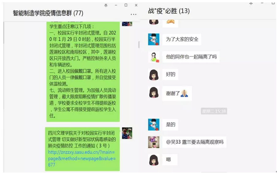 1月23日,公司通过网络召开了党政联席会,确定了以党总支书记李涛、经理杨成福为组长的公司疫情防控工作小组,把疫情防控作为当前重中之重的工作,全面贯彻落实中央和省委、省教育厅对防疫工作的要求,切实增强疫情防控工作的紧迫感和责任感;通过公司QQ群、微信群,迅速传达学习《公司关于切实做好新型冠状病毒感染的肺炎疫情防控工作的通知(1号)》文件精神及相关材料,统一思想认识,认清形势严峻,引起广大教职工重视;制定了每日统计全院师生健康情况,重点关心了解师生健康状态;确定了日报和零报告制度,自 2020 年 1 月23 日起,党政办主任唐瑜梅要于每日 17:00 前将公司师生新型冠状病毒感染的肺炎疫情报校医院值班人员处。