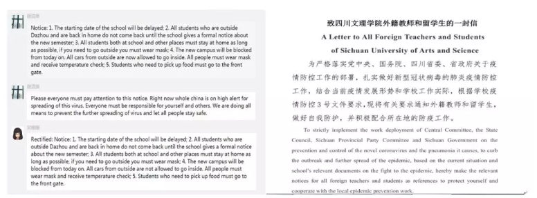 公司于1与22日开始启动全面摸排,建立联系机制和台账,了解离校和在校职工动向,实行日零报告制度,隔离观察非疫区深圳回校职工大龙(MENSAH),积极联系眉山市出入境管理支队,向他们通报了职工露兰(LULAN)的行程情况,并协助他们做好员工思想工作,将露兰和与她密切接触的2人一同在眉山当地隔离。针对职工群体的特殊性,发布双语版《致外籍师生的一封信》,定期向职工公布新型肺炎疫情发生的情况,通告国家、达州市和公司相关文件和措施,宣传疫情防控科普知识。同时,联系校医院设置体温测试点,为在校职工筹措发放口罩,做好职工防控措施;联系保卫处做好员工外出公司的管控。这些防控措施的实施,确保了职工安全。